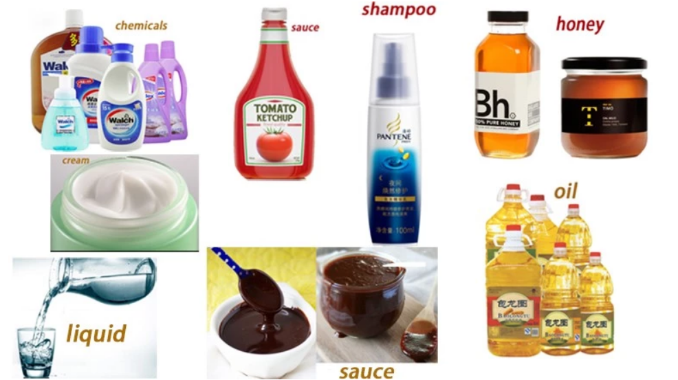 نیم چپچپا اور چپچپا مائع؛ کیٹس اپ ، سرسوں ، شربتیں ، سالسا ، میئونیز ، شہد ، مونگ پھلی مکھن ، جیلی ، ڈپنگ ساس ، ہونٹ بام ، شیمپو ، موٹی صابن ، اسٹائل جیل ، چہرے کے ماسک ، موم ، گلو ، چکنائی ، سیلنٹ ، سلیکون اور بہت کچھ